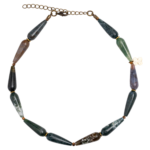 Llamativo collar con prismas de lapislázuli y bronces. Todos lo materiales son naturales y nunca hay dos piezas exactamente iguales.