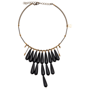 Llamativo collar de ágatas negras con un singular corte con forma de gotas planas. Todos lo materiales son naturales y nunca hay dos piezas