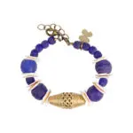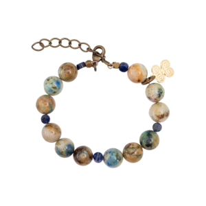 Llamativa pulsera de azurita y lapislázuli toda en colores tierra. Todos lo materiales son naturales y nunca hay dos piezas exactamente iguales.