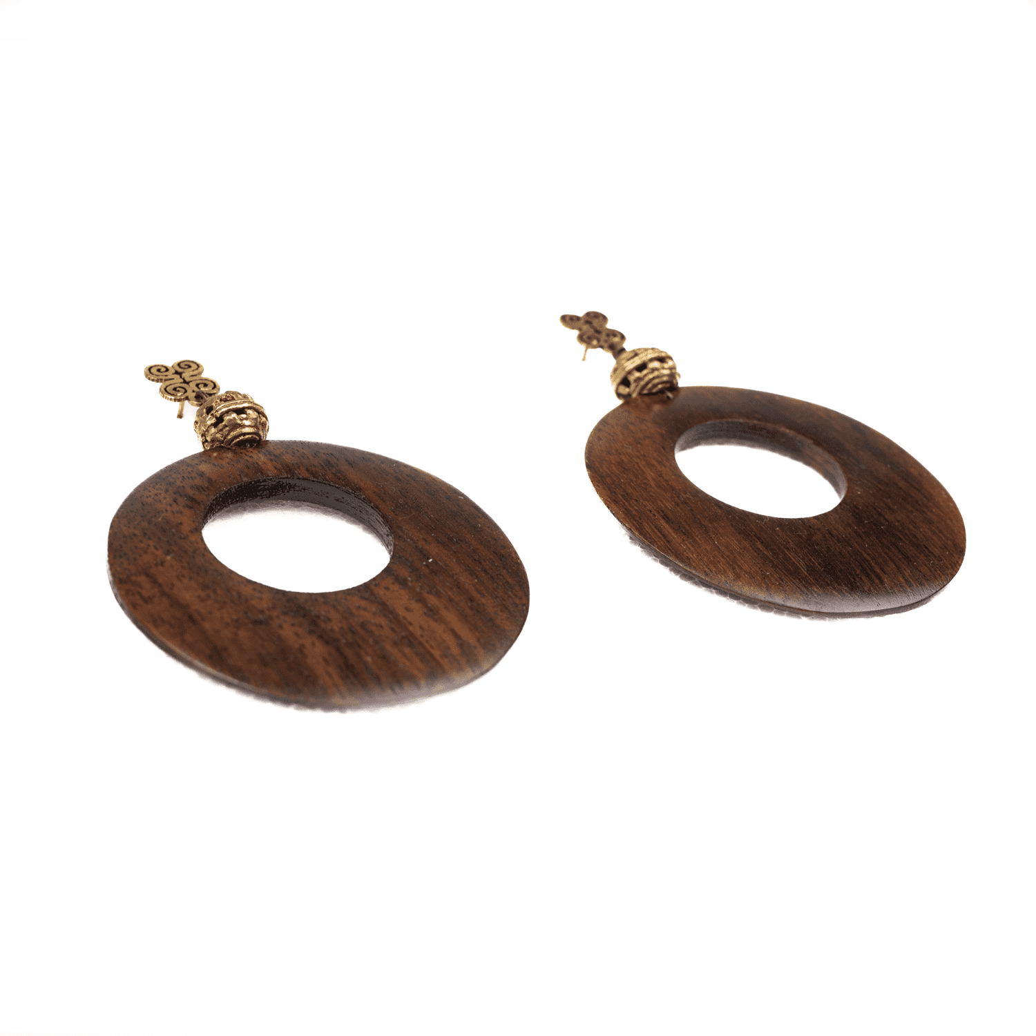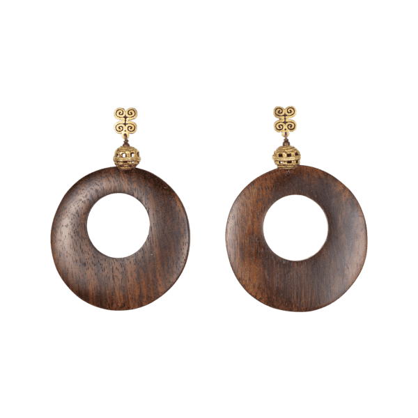 Preciosos pendientes de aros de madera de acacia y piezas de bronce hechos a mano de uno en uno a la cera perdida.