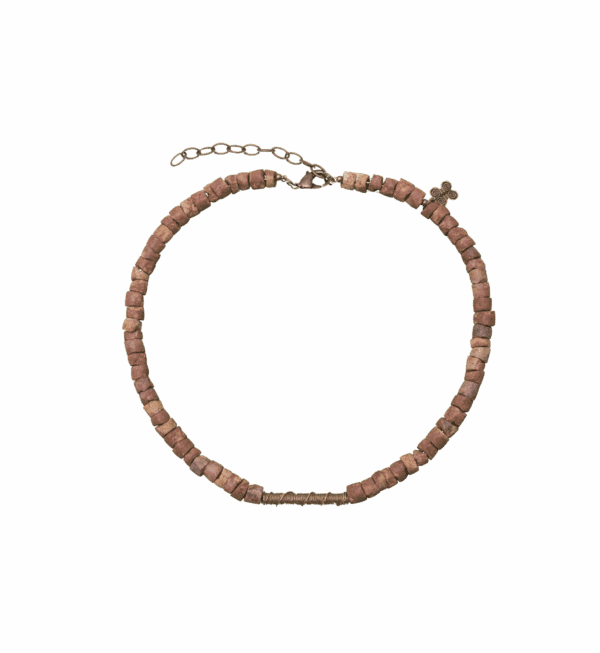 Piezas de bronce realizadas a la cera perdida una a una por manos artesanas combinadas con cuentas de bauxita también elaboradas de forma artesanal.