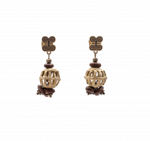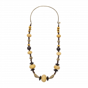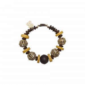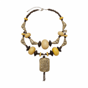 Collar hecho a mano en Tenerife (Islas Canarias) con varias piezas de bronce realizadas a la cera perdida uno a uno, semillas, discos de madera tropical y de resina de ámbar coronados por un espectacular bronce. Nunca encontraremos dos bronces iguales.