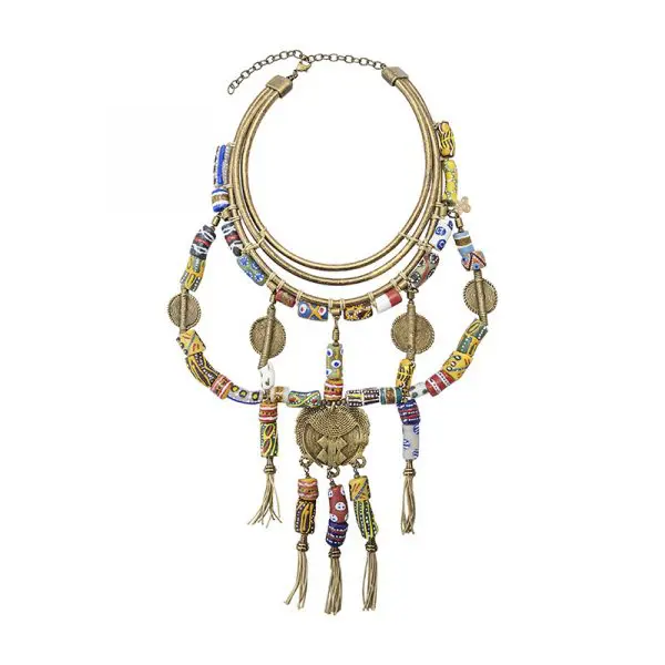 Collar hecho a mano en Tenerife (Islas Canarias) con piezas de bronce realizadas a la cera perdida una a una, favorecedores cilindros de cristal fundidos en crisoles de arena, elaborados y pintados individualmente por manos artesanas, engarzados sobre cuero nacional de primera calidad. Nunca encontraremos dos piezas de cristal ni bronces iguales.
