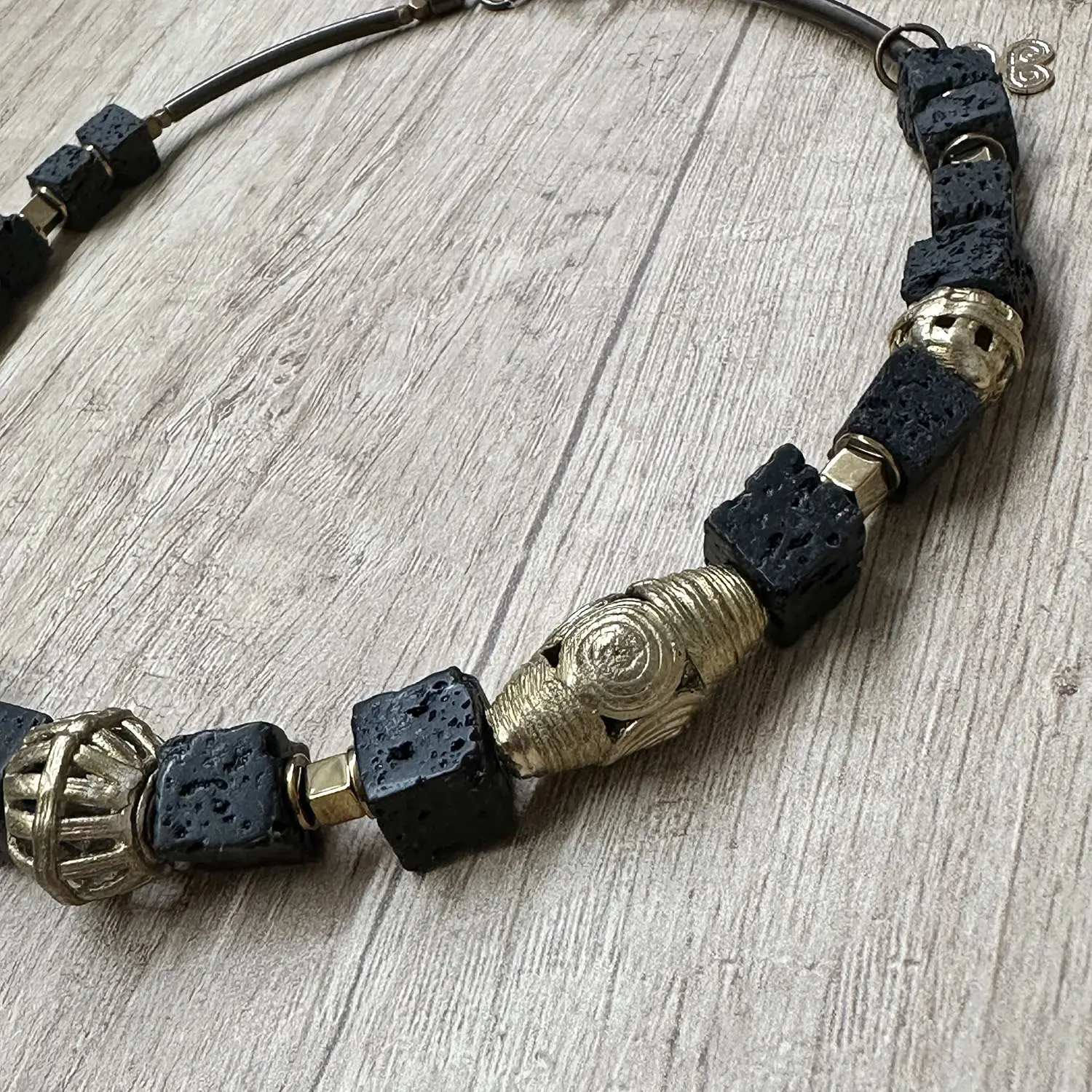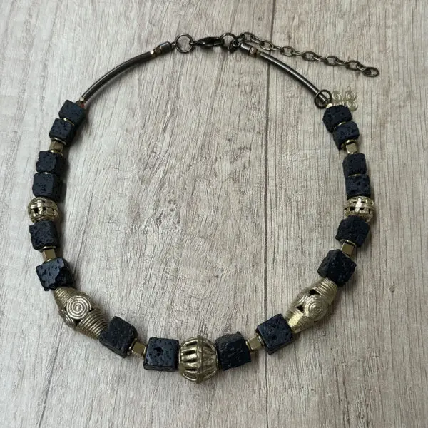 Singular collar de lava basáltica y bronces hechos a la cera perdida de uno en uno. Nunca hay dos piezas iguales.