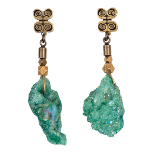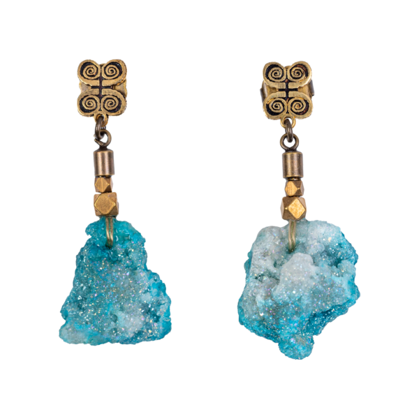 Espectaculares pendientes por la multitud de reflejos de las Geodas naturales y piezas de bronce realizados a mano a la cera perdida uno a uno.