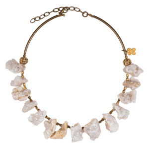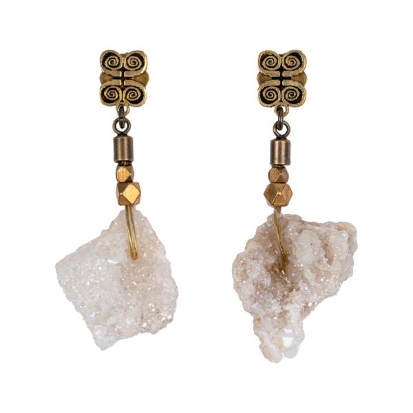 Espectaculares pendientes por la multitud de reflejos de las Geodas naturales y piezas de bronce realizados a mano a la cera perdida uno a uno.