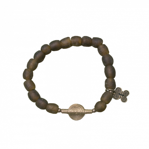Piezas de bronce realizadas a la cera perdida una a una por manos artesanas combinadas con cuentas de bauxita también elaboradas de forma artesanal.