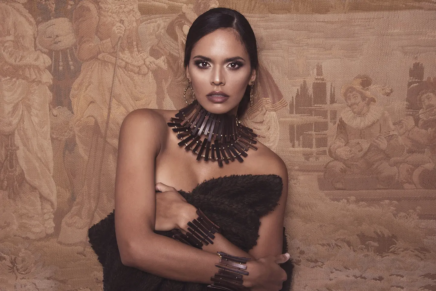Colección realizada con estilizadas piezas de madera de acacia y bronces, totalmente a mano y hechas a la cera perdida.