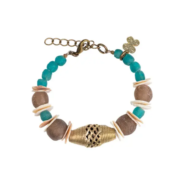 Preciosa pulsera de cristales hechos a mano en crisoles de arena, cuero nacional de primera calidad, conchas marinas y bronce hecho a mano a la cera perdida de uno en uno, engarzado sobre aro.