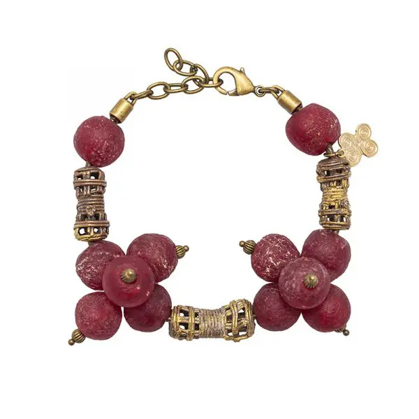 Pulsera hecha a mano en Tenerife (Islas Canarias) con piezas de bronce realizados a la cera perdida uno a uno, cuero nacional de primera calidad y favorecedoras bolas de cristal burdeos fundidas en crisoles de arena, elaboradas individualmente por manos artesanas con diferentes tipos de engarces. Nunca encontraremos dos piezas de cristal ni bronces iguales.