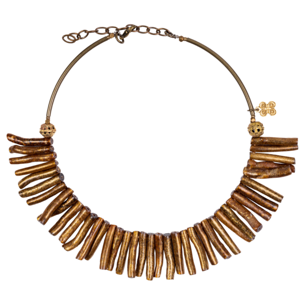 Precioso collar de coral teñido de oro viejo y nuestro característico engarce y prismas de bronce hecho a la cera perdida a mano.